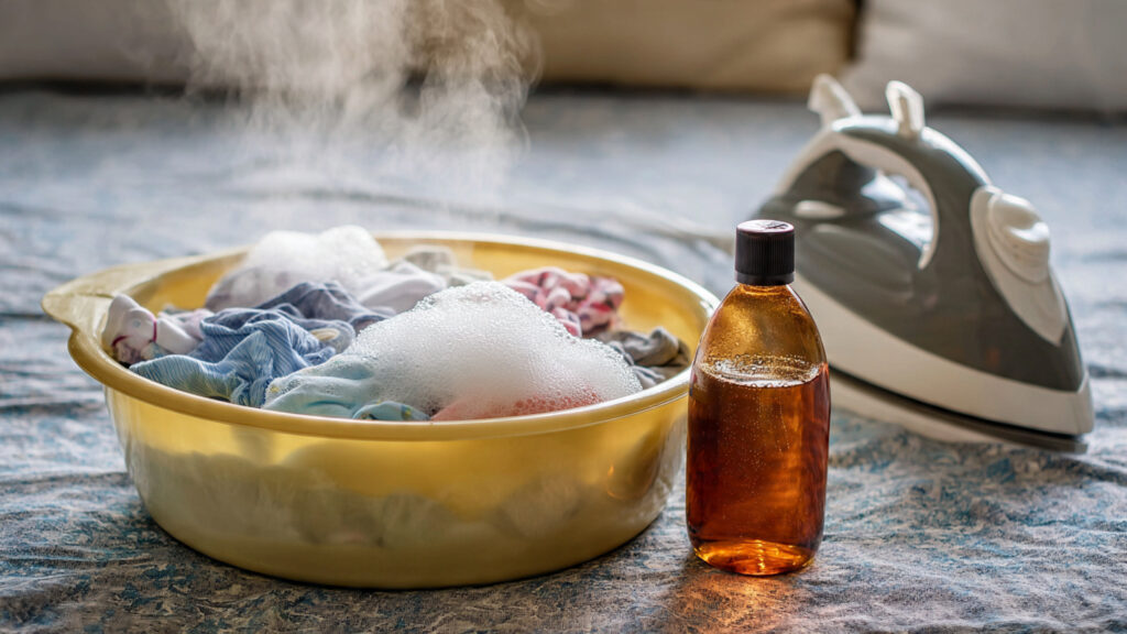 • Dans une bassine, mélangez de l’eau tiède avec de la lessive ET un désinfectant liquide (type Dettol ou quelques gouttes d’eau de Javel si le vêtement est blanc/grand teint).