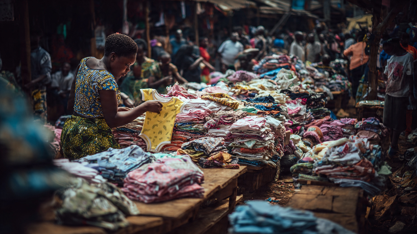 2. La « Balle » (Friperie) : Des vêtements d’occasion venus d’Europe ou des USA, vendus en tas ou sur cintre.